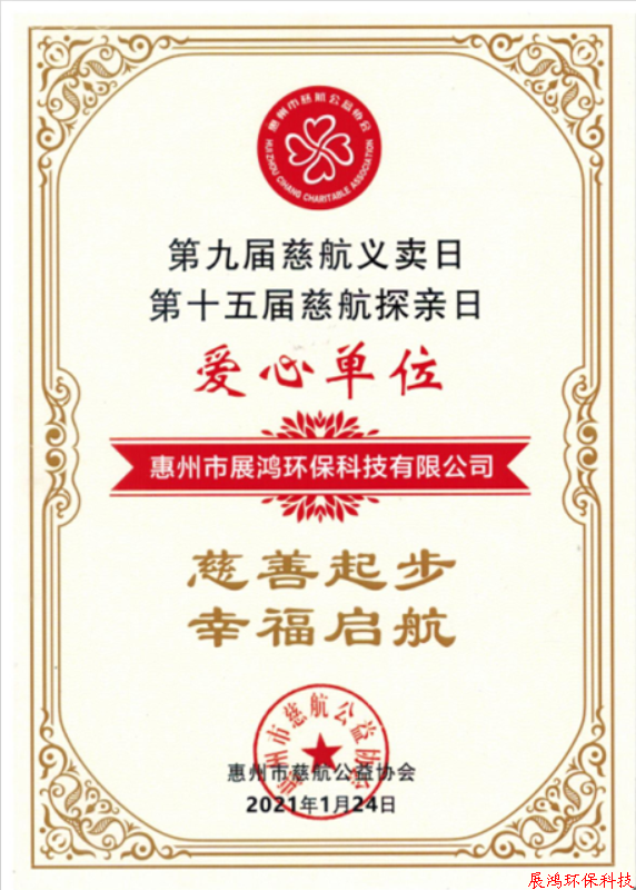 2021年第九届慈航义卖日暨第十五届慈航探亲日活动,惠州市展鸿环保科技有限公司荣获慈航公益协会爱心单位称号,多年的公益服务树立了公司一直以来为回报社会的理念,公益路上我们一直在行动!感恩社会各界及朋友对公司多年的支持于鼓励!