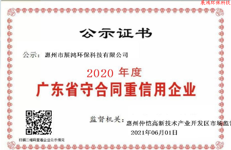 展鸿环保科技公司荣获2020年度广东省守合同重信用企业称号!